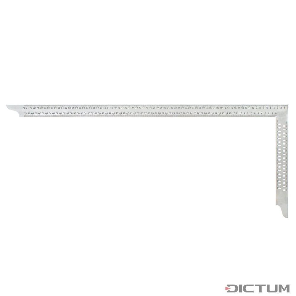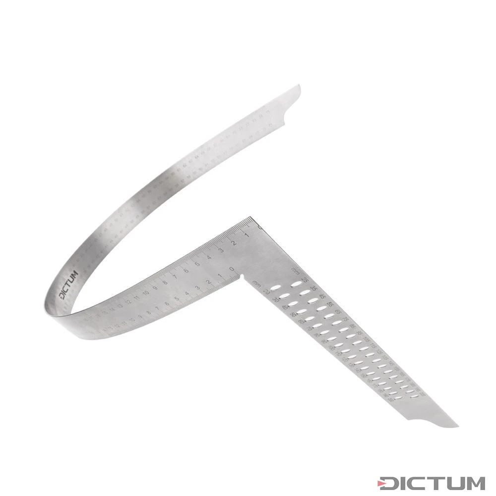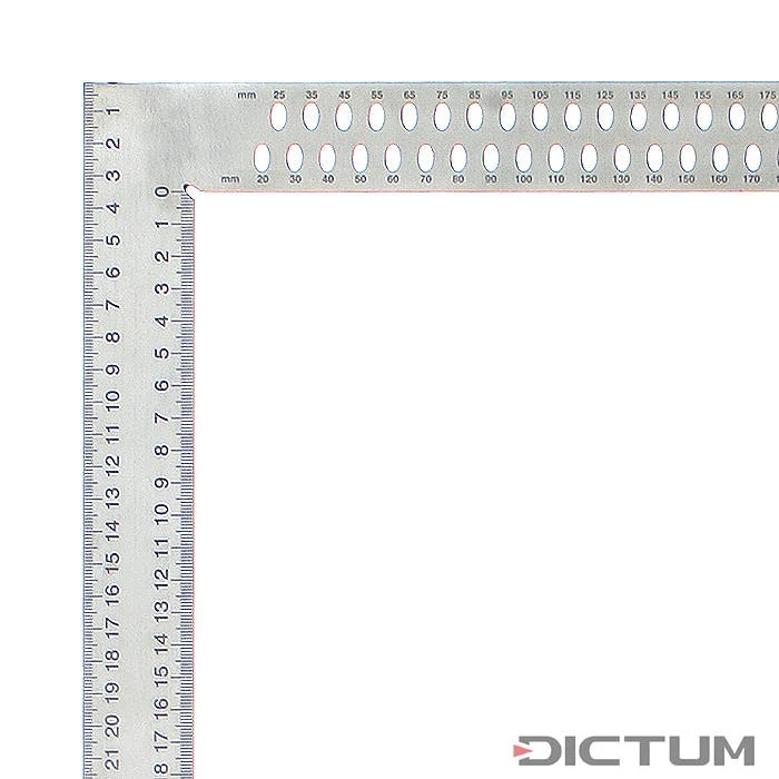 L’équerre standard pour tout charpentier, acier à ressort inoxydable, réalisée sans soudure. Avec la graduation durable de la face supérieure et de la face inférieure les dimensions externes et internes peuvent être mesurées et tracées. Les trous de la branche courte servent au traçage parallèle au pas de 5 mm. Pour cela, la branche longue sert de butée, alors que la forme ovale des trous aide au centrage du crayon lorsque l’on tire. Précision 0,05 mm sur 100 mm