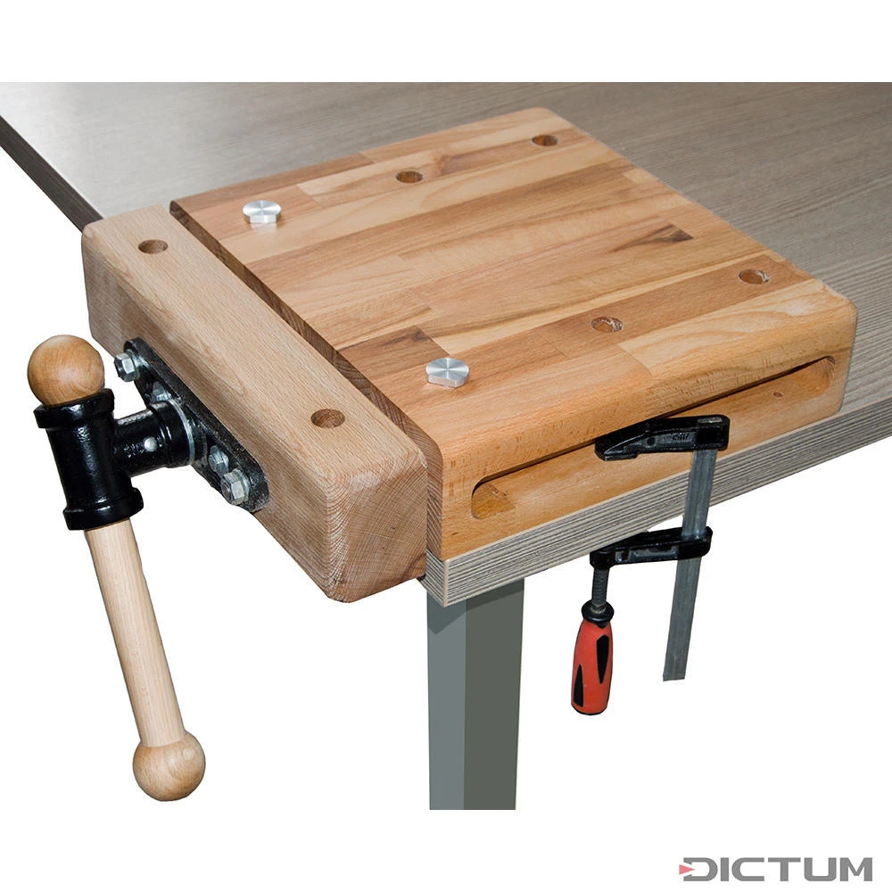 Presse d’établi frontale en hêtre massif qui peut être fixée sur toute table stable, au moyen de deux rainures latérales. Pour une utilisation comme établi, la presse peut également être fixée de manière permanente sur un plateau de table au moyen des trous prévus. Le panneau de 80 mm d’épaisseur est doté de deux lignes de trous de Ø 19 mm (qui conviennent également pour les accessoires de serrage Veritas) et de 4 valets d’établi cylindriques en aluminium (non escamotables). Une vis de réglage à l’intérieur de la presse (utilisable du côté gauche et du côté droit) permet, lors d’un serrage unilatéral, d’obtenir une contre-pression et ainsi d’empêcher le gauchissement des mâchoires de serrage. Surface huilée. Ouverture de la presse 120 mm. Diamètre de broche 23 mm.