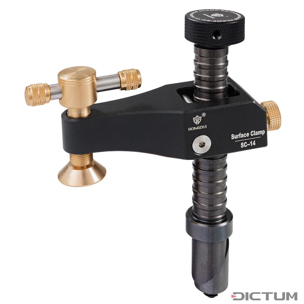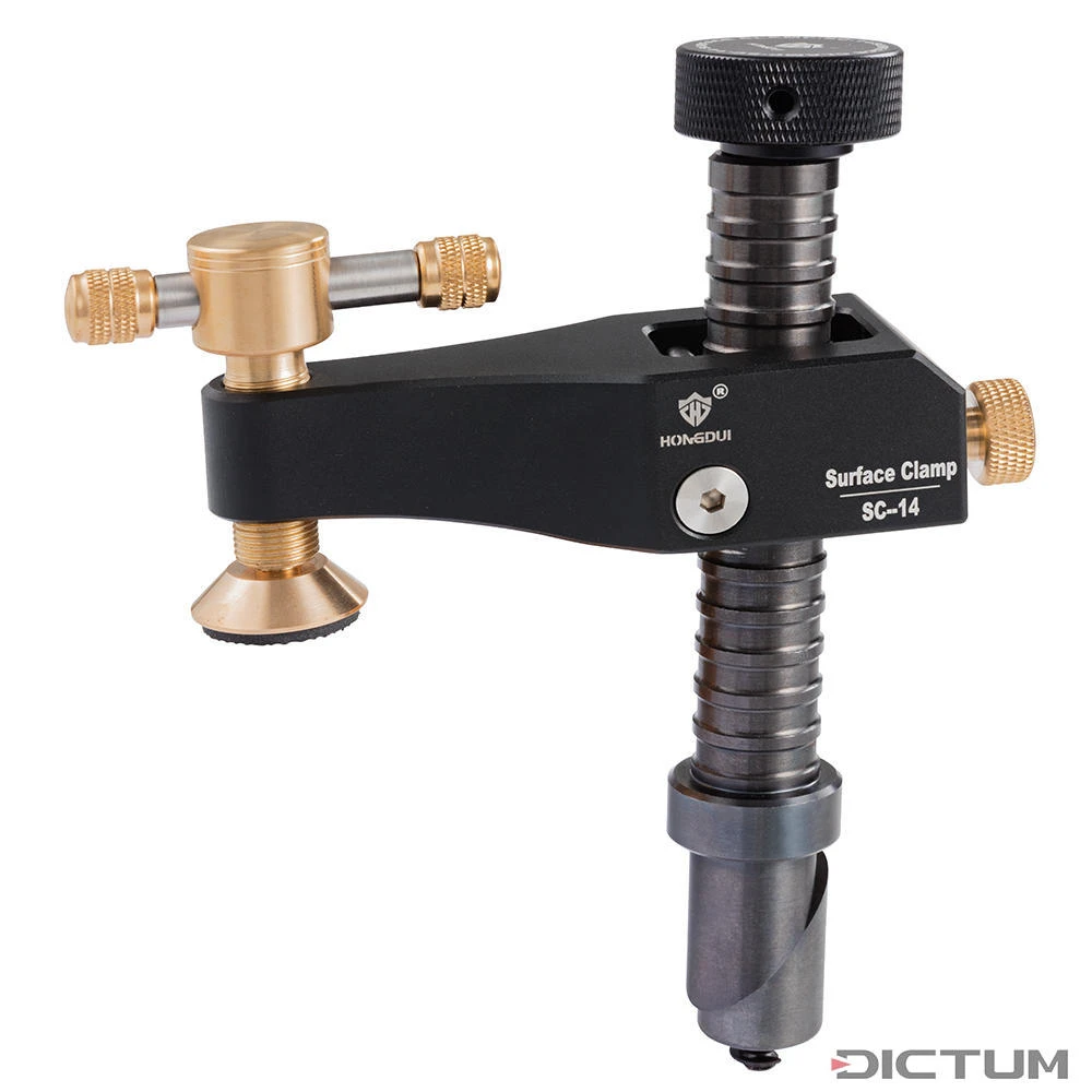 Équipé d’un boulon de serrage, le système de serrage peut être ancré dans des trous de 19-20 mm. Idéal pour les travaux sur les tables multifonctions ou les établis. Le boulon fendu à l’extrémité inférieure de la tige est inséré dans le trou et serré par le haut à l’aide d’une vis moletée, ce qui le coince dans le trou en toute sécurité. Le bras d’extension s’enclenche de manière automatique sur la tige rainurée, idéal pour un réglage rapide de la hauteur de serrage. Une vis moletée à l’arrière permet de fixer le bras d’extension dans sa position, ce qui est idéal pour les fabrications en série. La poignée sur la vis de pression en laiton assure une grande force de serrage avec peu d’effort.