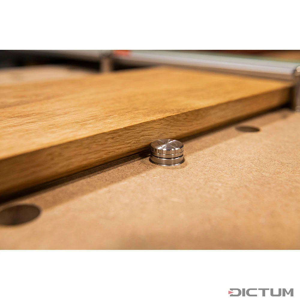 Les valets UJK Expanding Dogs sont une version plus courte et un peu plus simple des Parf Super Dogs. Ils disposent du même mécanisme de verrouillage et sont également fabriqués en acier inoxydable haut de gamme. Conviennent à la la table multifonctions Festool MFT/3 et à d’autres tables avec des perçages de 20 mm. Le valet d’établi d’expansion Expanding Dog est bloqué dans le trou à l’aide d’un bouton rotatif situé sur le dessus. Une fois verrouillé, le valet est fixé de manière sûre dans le trou. Une simple rotation dans la direction opposée permet de desserrer le valet d’expansion. Chaque valet d’établi contient une partie de col chanfreinée qui s’aligne dans les trous chanfreinés de 20 mm des plaques perforées.